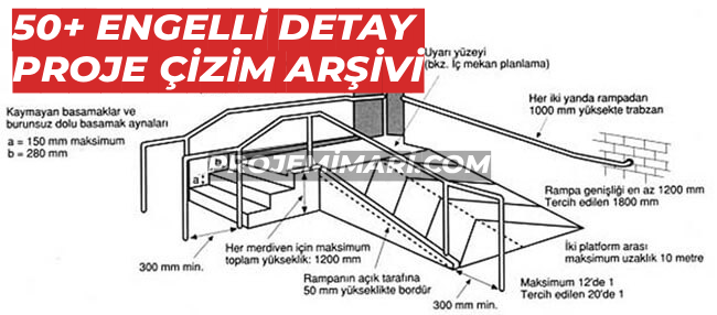 - Engelli Rampa Detayları: Farklı eğim oranlarına (%6, %8) göre plan ve kesitler, sahanlık ölçüleri, korkuluk ve küpeşte detayları, başlangıç ve bitiş noktaları için uyarıcı yüzeyler.